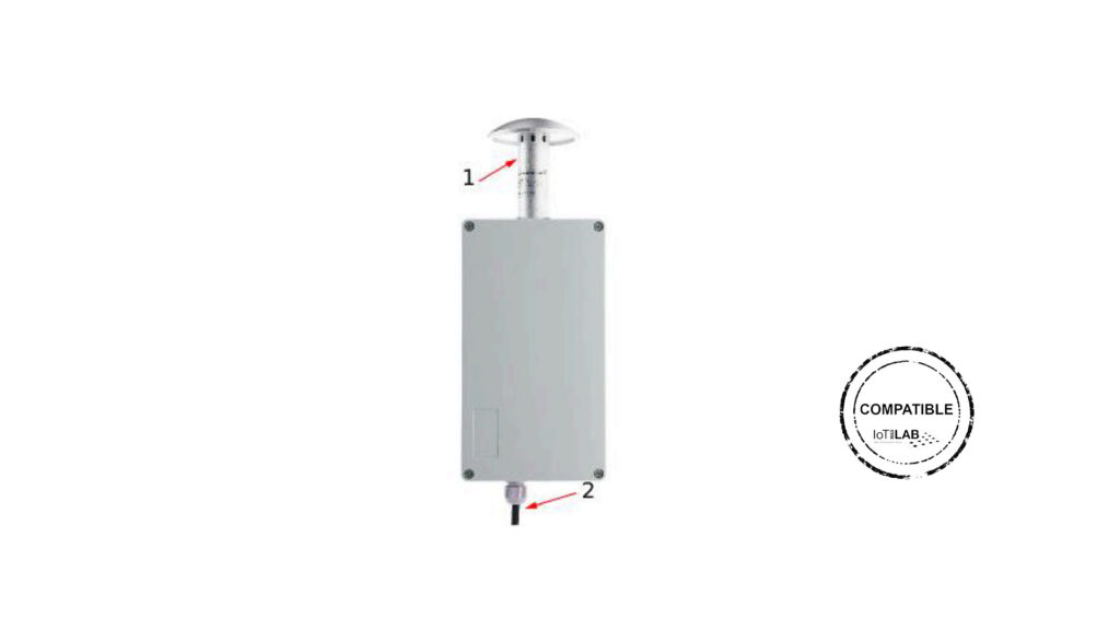 El equipo RL-AQ-6LP realiza la medición de magnitudes físicas (partículas en suspensión PM2.5 y PM10, gases NO2 y CO) con un periodo de 300 segundos y envía los valores a la nube por medio de una red 6LoWPAN. En la imagen: 1) Sensor de partículas y gases 2) Cable de alimentación