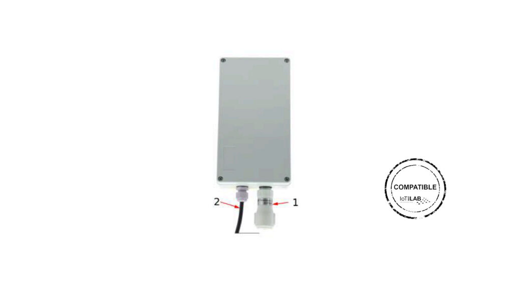 El equipo RL-UV-6LP realiza la medición de magnitudes físicas (rayos UV) con un periodo de 300 segundos y envía los valores a la nube por medio de una red 6LoWPAN. En la imagen: 1) Sensor de rayos UV 2) Cable de alimentación